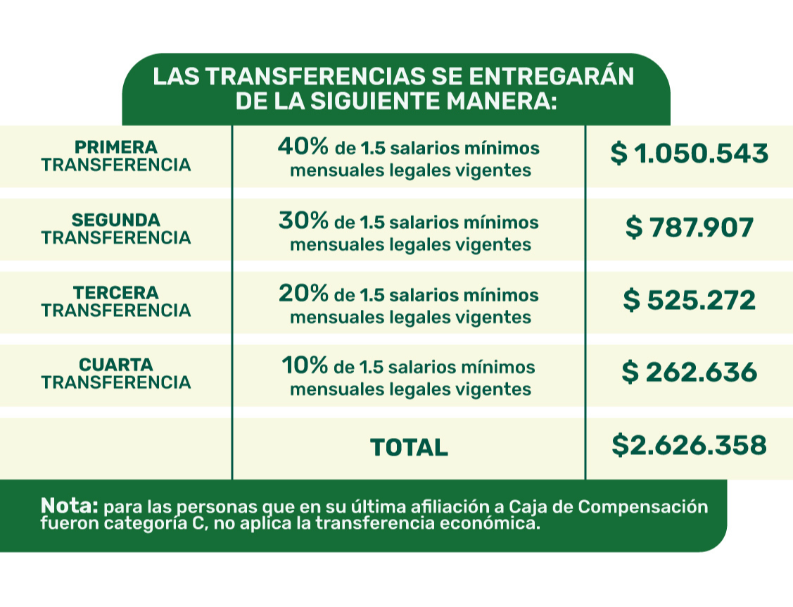 - Transferencia económica máximo cuatro (4) meses, por un valor de uno punto cinco (1.5) SMMLV divididos en cuatro (4) cuotas, para aquellos cotizantes en categoría A y B del Sistema de Subsidio Familiar.
